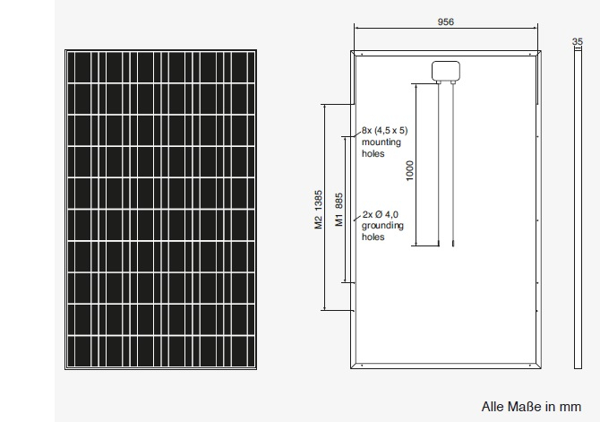 Aufbau Vorderseite : 3,2 mm gehärtetes Weißglas Zellen : 60 monokristalline Hochleistungszellen Zellen Maße : 158,75 mm x 158,75 mm Rückseite : Verbundfolie Rahmen : 35 mm schwarzer Aluminiumrahmen Maße Modul : LxBxH 1665 x 1002 x 35 mm Gewicht Modul : 19 kg mit Rahmen |