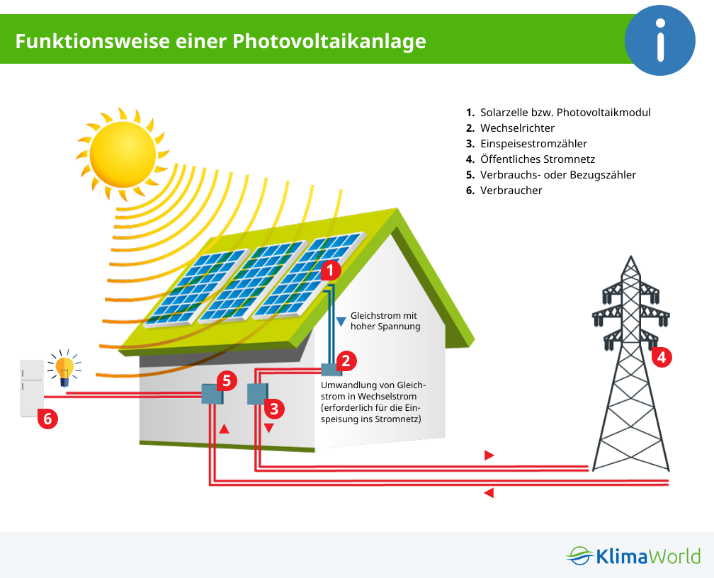 Der erste entscheidende Unterschied zur Solarthermie ist die Art der Energie, in was das Sonnenlicht umgewandelt wird. Photovoltaikanlagen wandeln die eingefangene Sonnenenergie in Strom um. Dieser Strom wandert entweder in einen Stromspeicher für spätere Nutzung oder direkt in den Haushalt, wo er bei Bedarf sofort eingesetzt wird. Denn eine Photovoltaikanlage produziert nur Strom, wenn er auch gebraucht wird, sprich: Wenn ein elektrisches Gerät eingeschaltet wird. Ansonsten wird keine Energie aus der Sonne gewonnen, egal wie viel Sonnenlicht auf die Anlage scheint. Da der Verbrauch von Strom jedoch meist variiert und der Bedarf meist am Abend erfolgt, scheint logischerweise keine Sonne mehr. Zum Glück können Photovoltaikanlagen auch nachts oder bei schwachem Sonnenlicht die Energie umwandeln. Das ist bei einer Solarthermie nicht der Fall.
