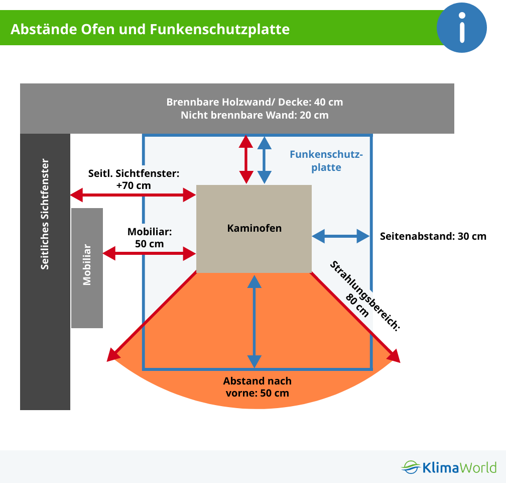 Beim Einbau eines Schwedenofens an seinem Verwendungsort gibt es einige Vorschriften zu beachten, die auf alle Kaminöfen zutreffen. So müssen etwa die notwendigen Abstände des Schwedenofens zu Möbeln und Wänden unbedingt eingehalten werden. Als Richtwerte gelten ein Abstand von 20 cm zu Wänden, was sich auf 40 cm erhöht, wenn diese aus einem brennbaren Material wie Holz besteht. Möbel sollten mindestens 50cm vom Schwedenofen entfernt stehen, im Strahlungsbereich im vorderen Bereich der Feuerstätte sogar mindestens 80cm. Alle weiteren wichtigen Werte und Vorschriften den Schwedenofen betreffend können Sie in den Blogbeiträgen zum richtigen Abstand zwischen Kaminofen, Möbeln und Wand sowie den Sicherheitshinweisen für die Ofenrohrmontage nachlesen. Achten Sie vor dem Kauf darauf, dass all diese Abstände eingehalten werden können. Zudem ist es wichtig, dass der Boden mit einer Funkenschutzplatte geschützt wird – auch dieses sollten Sie nicht vergessen, einzuplanen.