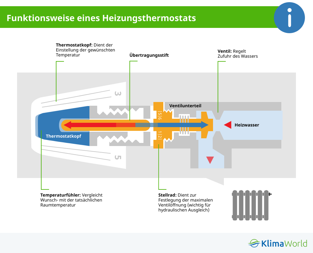 Die Funktionsweise eines Thermostats wird von dem enthaltenen Stift, sowie dem wärmeempfindlichen Material im Kopf bestimmt. Ist der Thermostatkopf nicht montiert, werden Sie an der Heizung einen kleinen Stift sehen, der herausragt. Auch am Thermostatkopf selbst finden Sie einen ähnlichen Stift. Durch Drehung des Kopfes wird beeinflusst, wie weit dieser Stift herausragt. Im montierten Zustand liegen beide Stifte aufeinander und der Stift des Thermostatkopfs drückt den Stift in der Heizung tiefer in den Heizkörper hinein. Dort wird durch diesen Vorgang das Zuflussrohr für heißes Wasser verengt. Je tiefer der Stift in der Heizung ist, desto weniger Wärme wird von der Heizung erzeugt. Bei enger Rohrstellung fließt weniger Wasser hindurch, bei offenem Rohr wird mehr Wasser in die Heizung geleitet.
