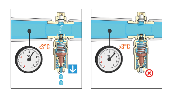 Das Frostschutzventil öffnet zum Entleeren des Systems, sobald die Temperatur des Mediums eine Temperatur von 3 °C erreicht. Es schließt, sobald die Mediumtemperatur wieder 4 °C erreicht hat. Damit das Ventil einwandfrei arbeiten kann, darf es nach Einbau nicht isoliert werden.