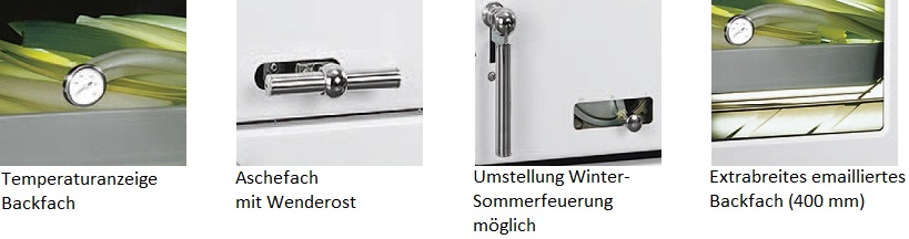 Der Justus Festbrennstoffherd im rustikalen Design in weiß. Mit dem Backfach auf der rechten Seite.