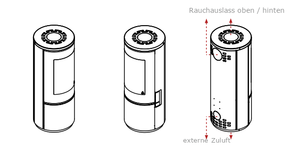 Der Rauchrohrausgang kann optional für oben oder hinten gewählt werden, auch eine externe Luftzufuhr ist am Kamin vorgesehen.