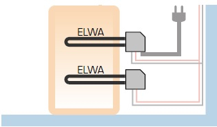 Zwei ELWA Heizstäbe arbeiten im Schichtladebetrieb. Ein Gerät ist im oberen, das andere im unteren Teil des Speichers installiert. Vorteil: Warmwasser ist schneller verfügbar. Die Kommunikation der ELWAs erfolgt über die DC-Leitung. Es ist keine zusätzliche Verkabelung erforderlich. Das Solar-Module-Set mit Elwa Heizstab wird ohne separaten Wechselrichter verkauft, da dieser schon im Elwa Heizstab verbaut ist. Im Solarmodul wird die Sonnenenergie in Gleichstrom umgewandelt, danach im Wechselrichter des Elwas zu Wechselstrom verarbeitet.