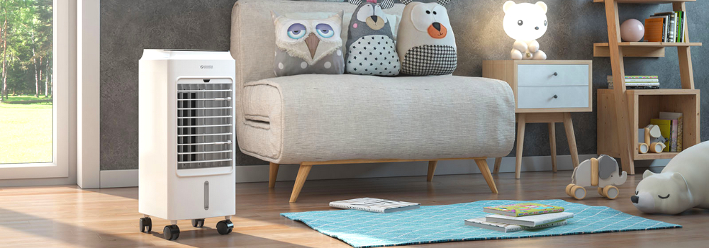 Der kompakte, benutzerfreundliche Luftkühler neutralisiert Schadstoffpartikel und verteilt die frische, kühle Luft dank Swing-Funktion gleichmäßig im Raum.