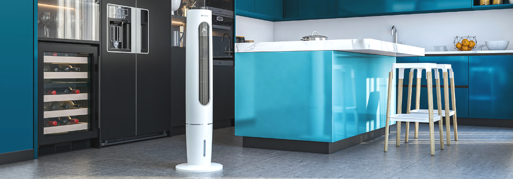 Der Luftkühler im attraktiven Säulendesign neutralisiert Schadstoffpartikel und verteilt die frische, kühle Luft dank Swing-Funktion gleichmäßig im Raum.