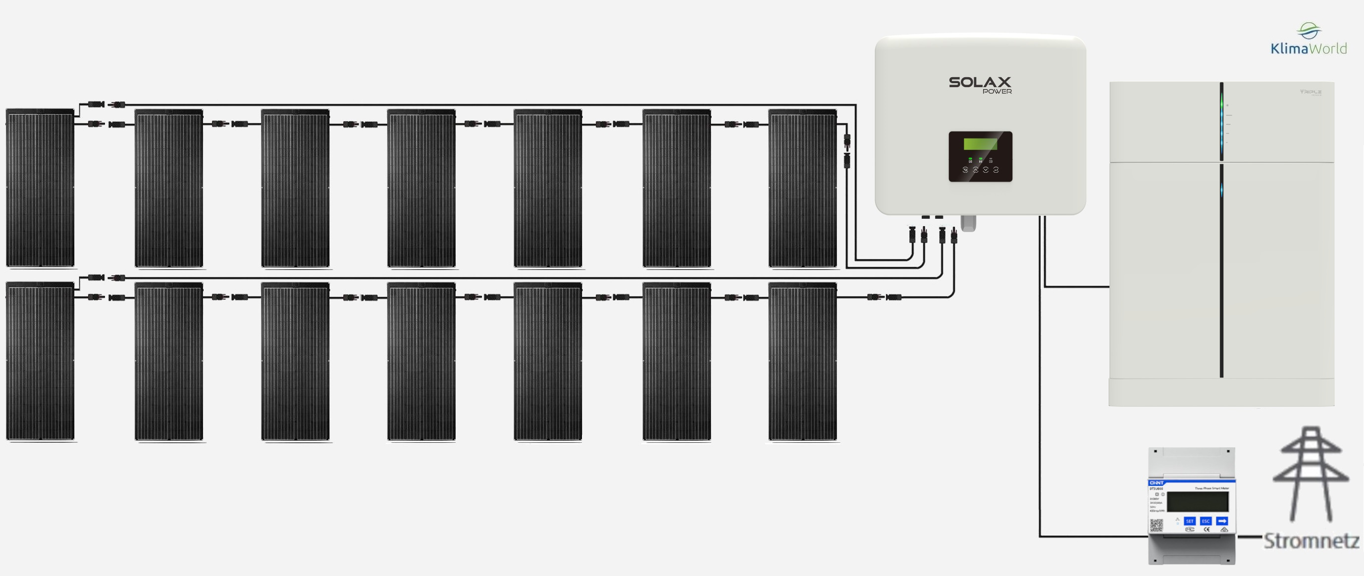 Es gibt mehrere Möglichkeiten die Module zu montieren, wir zeigen Ihnen hier ein Montagebeispiel in Reihe mit OST/WEST Ausrichtung. Die Module werden über die Standardstecker mit dem Wechselrichter in Reihe verbunden (auf 2 Strings). Durch das vorgefertigte Plug and Play Steck-System, gestaltet sich die Installation zwischen Wechselrichter und Batterie-System ebenfalls denkbar einfach. Das bedeutet in der Praxis, dass die Verkabelung und Installation zwischen Wechselrichter und Batterie-System, auch ohne handwerklich versierten Monteur, schnell, einfach und fehlerfrei durchgeführt werden kann. Bitte beachten Sie bei Anschluss der Anlage an Ihr Hausstromnetz, dass die Installation nur von qualifizierten Elektrotechnik-Fachbetrieben durchgeführt wird. Durch die integrierte Notfallabschaltung erfüllen die Solaranlage alle Sicherheitsanforderungen.
