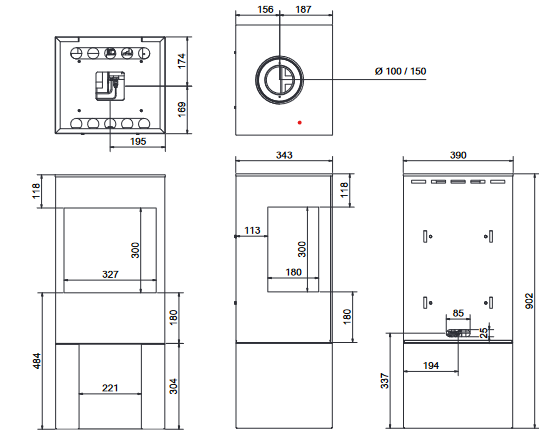 - Abgasstutzen: Ø 100/150 mm | Anschluss oben