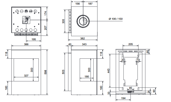 - Abgasstutzen: Ø 100/150 mm | Anschluss oben