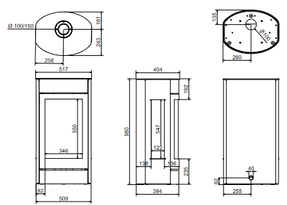 - Abgasstutzen: Ø 100/150 mm | Anschluss oben