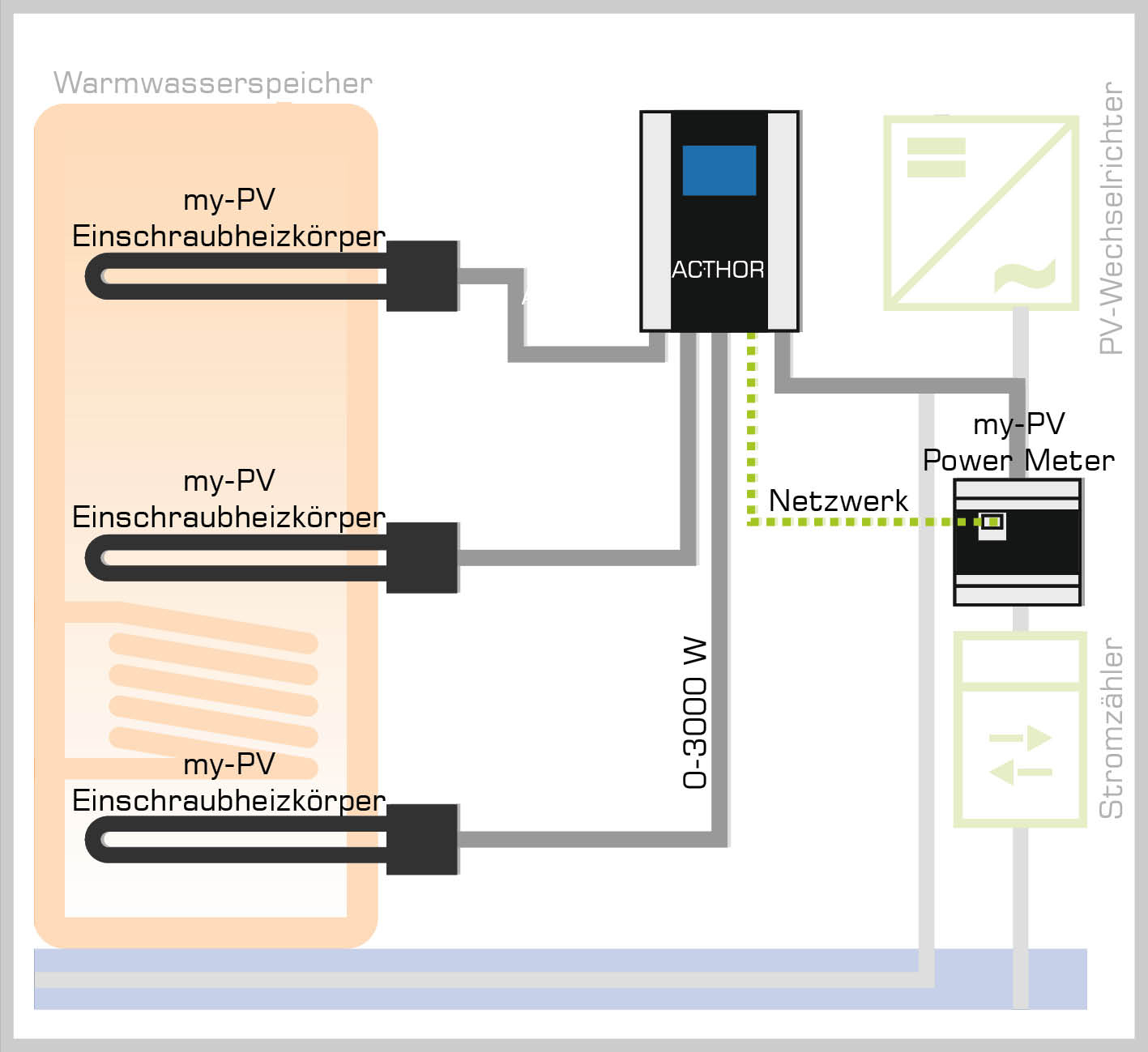 Produkt: Warmwasserbereitung mit Solarstrom | Schichtbeladung 3 × 3 kW | MYPV